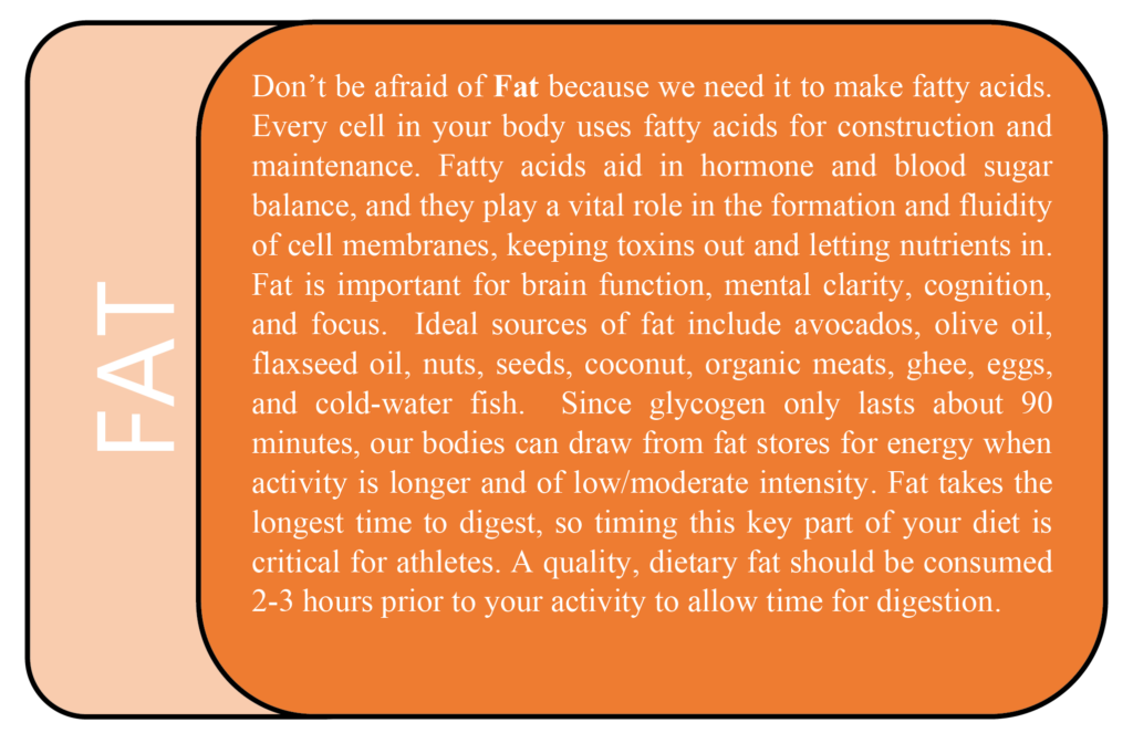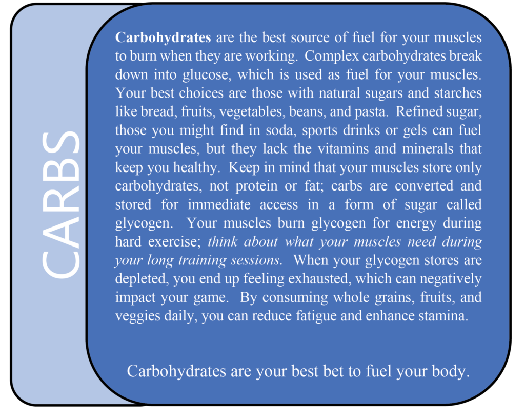 Whether you are new to a sport or a seasoned competitor, you can use foods and fluids to optimize your performance, boost your energy and aid in your recovery. Today we are going to focus on fuel, and save hydration for another time. What and when you eat can either enhance or derail your game, so choose wisely. Nutrients and meal timing that match your workout style can help you be stronger, train harder, and compete better. Don’t experiment on game day. Every time you play your sport, practice your fueling as well. Let’s get started with an introduction to your new playing partners, macronutrients.