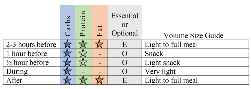 Tips: Keep your carbs simple, non-starchy and low in fiber. Supplemental sources of protein (protein powder, avoid casein) digest quicker than whole food protein. Avoid fats close to activity to allow for quick digestion, absorption, and energy availability during exercise.