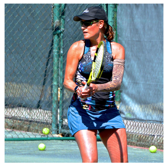 Jacqui playing her favorite sport wearing her LympheDIVA sleeve
